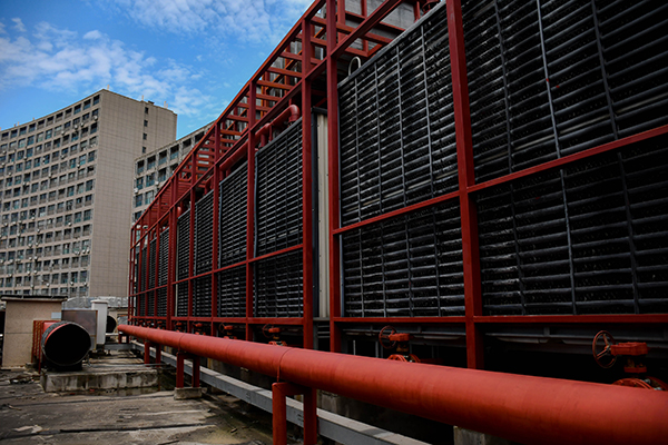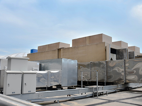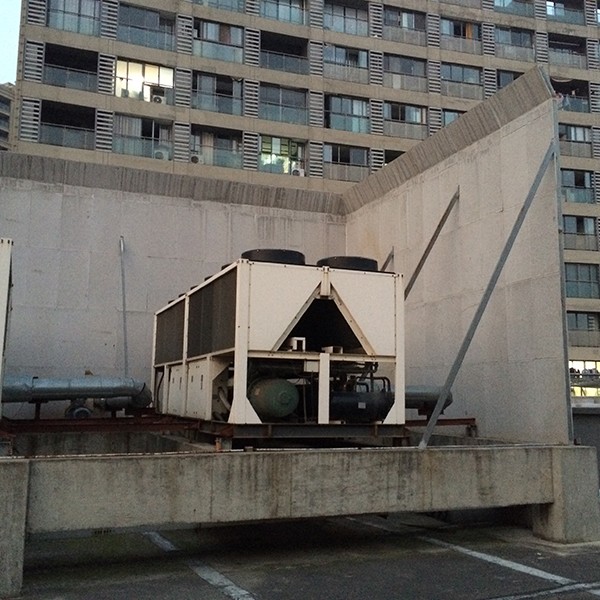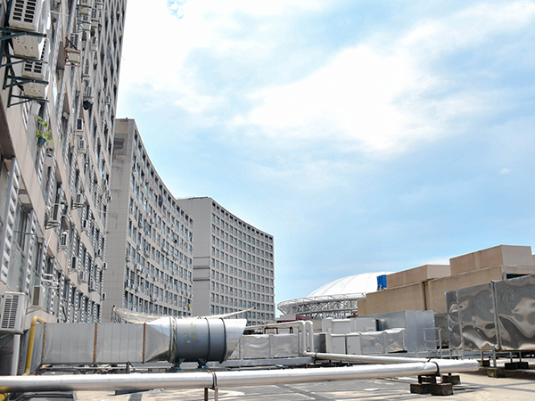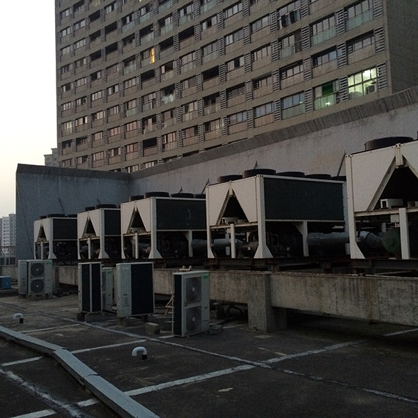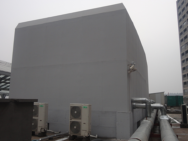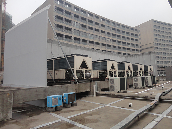 弘阳广场位于南京市浦口区,是南京市知名的大型商业综合体。集合了各种商业业态,并有单独公寓用房。商业设施的增加,各种声音的混杂,必然使住户的居住体验降低。经现场勘察,商场楼顶分布的4台冷却塔、6组热泵机组、10台排烟风机是主要的噪声源。此区域为二类声环境功能区,需要达到昼间60dB,夜间50dB标准。我司从降低成本并达到治理效果方面出发,充分考虑各种因素的影响,设计一套完整的施工方案,以期满足商场方及住户的需求。 冷却塔噪声治理措施 对冷却塔安装半开放式吸隔声罩,从进气、排气和整体吸隔声降噪三个方面实施。冷却塔排气部位安装排气消声器,靠近居民区一侧采用吸隔声罩设计,其他区域开放,利于散热。 风冷热泵机组噪声治理措施 热泵机组的主要噪声源为压缩机噪声,次要噪声源为风扇噪声。从噪声治理角度,设备存在以下问题:所有热泵机组没有安装任何降噪处理设备,其辐射噪声直接扩散到周围空间;热泵机组距近住户,噪声沿传播路径衰减不足,且热泵机组数量众多,噪声叠加后总噪声级较大。 我们针对所有热泵机组,设计了吸隔声罩来限制辐射噪声的扩散。吸隔声罩部分区域进行封闭,保留下部敞开,以确保设备的正常通风。安装我公司设计的JO-IA吸隔声板和JO-AO 型消声器,在相邻空调机组的上方间隙处安装进风消声器,为空调提供进风通道。 排油烟风机噪声治理措施 风机噪声主要表现为排风口噪声及风机机械噪声,由于现场均为大功率风机 (15-30kw),单台风机噪声级接近 90dB(A),因此对风机的降噪量需达到 25dB(A) 以上。采用建造吸隔声罩,加风口安装排风消声器相结合的措施进行降噪。